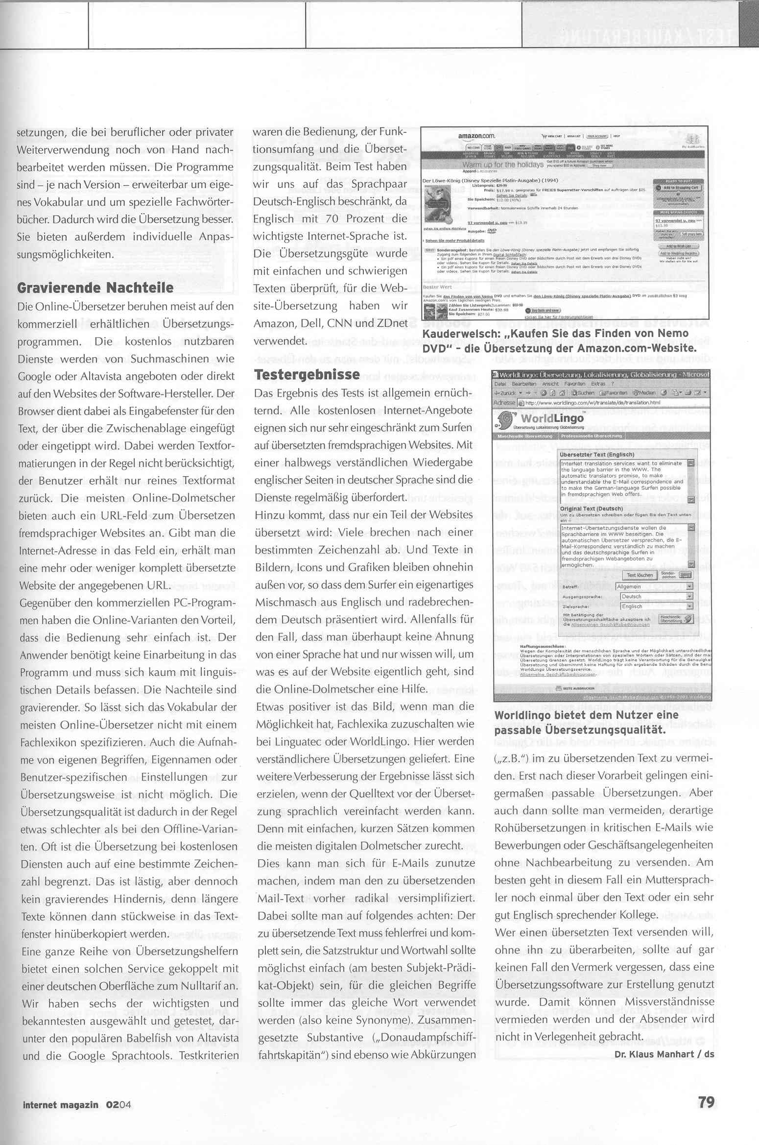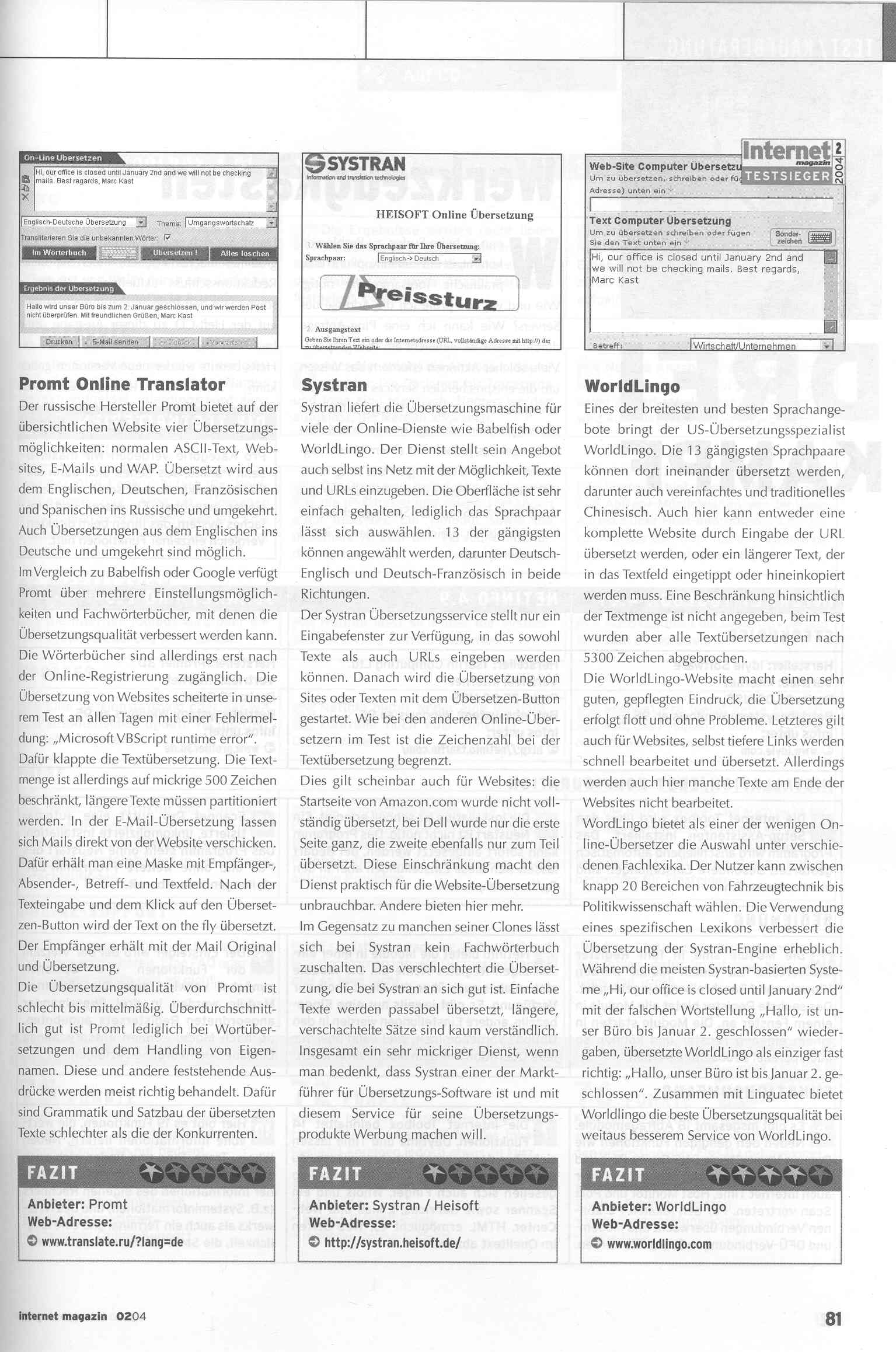 Im InternetMagazin 02/2004 wurden Übersetzungsdienste bewertet, hier der eingescannte Artikel (Blatt1 uebersetzer1 (jpg, 318 KB)